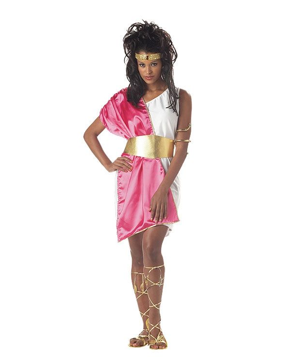 Женская тога включает в себя белое платье, розовую пелерину на плечо и пояс золотистого цвета. Такой наряд идеален для тематических вечеринок и выступлений. К этому костюму вы можете подобрать различные аксессуары чтобы дополнить свой образ.