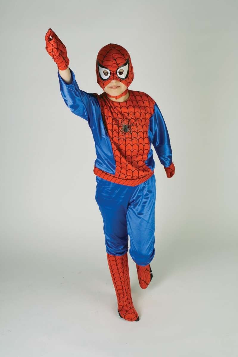 Костюм Человека-Паука для детей - атласный костюм, выполненный в красно-синем цвете. В комплект входит футболка с длинными рукавами с красной вставкой и узором в виде паутины, синие брюки, а также красная маска на глаза.