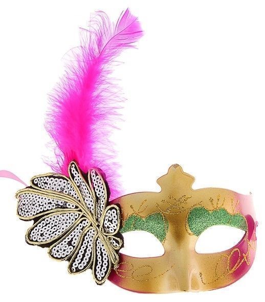 Маска золотистая с серебристым пером из пайеток и легким розовым перышком. Маска станет приятным дополнением к маскарадному костюму или может использоваться в качестве самостоятельного аксессуара. Маска сделана из пластика и имеет размер 7х14х17 см.