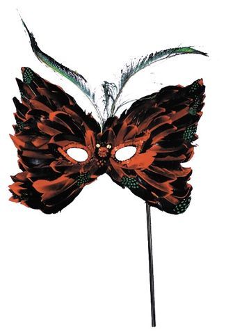 Маска Бабочка с рукояткой выполнена из красивых перьев различного цвета. К маске прикреплена тонкий держатель. Эта маска идеально подойдёт для маскарадов и карнавалов.