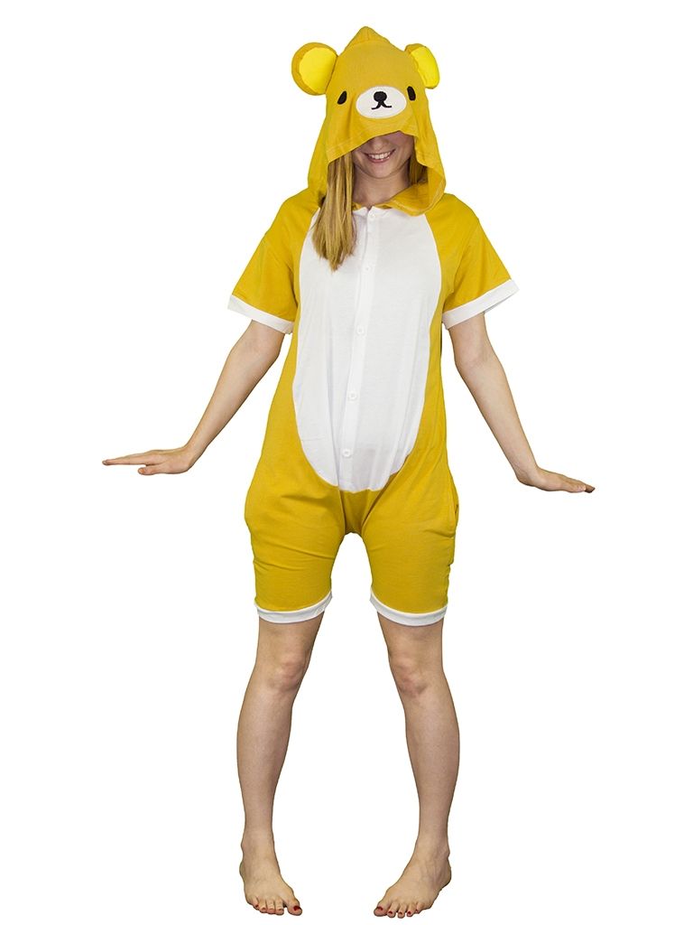 Пижама-кигуруми Мишка с шортиками - яркая пижама, выполненная в желтом цвете. Кигуруми с короткими рукавами и капюшоном с мордочкой мишки с ушками. Спереди имеется овальная белая вставка. Застегивается на маленькие пуговицы.