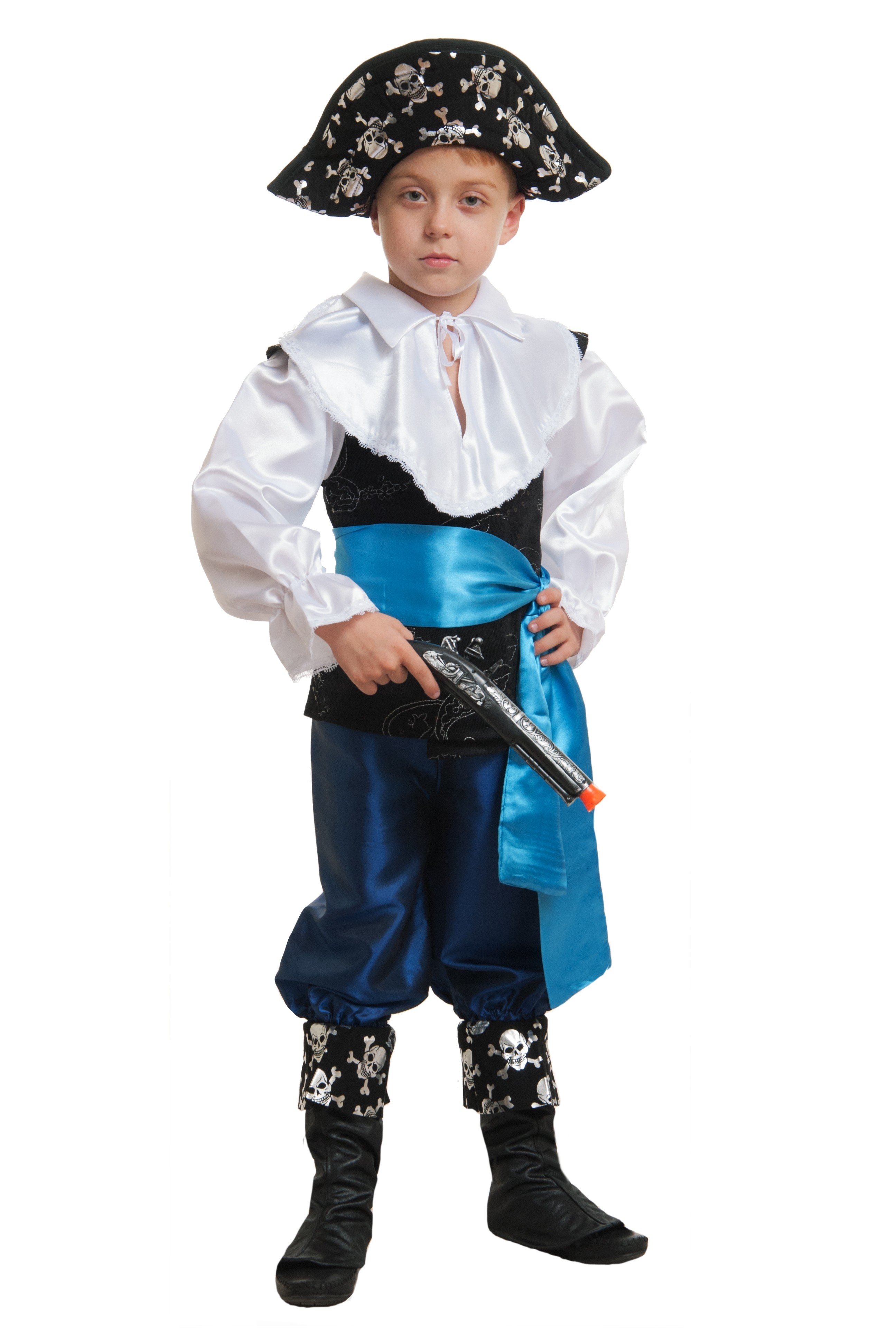 Костюм капитана Флинта для детей представляет собой образ капитана пиратов из "Острова Сокровищ". В комплект входят синие атласные штаны свободного кроя, черные накладки на обувь, имитирующие сапоги, атласный голубой пояс, камзол-рубаха, а также образ завершает пиратская шляпа черного цвета, дополненная серебряными черепками и мушкет из пластикового материала.