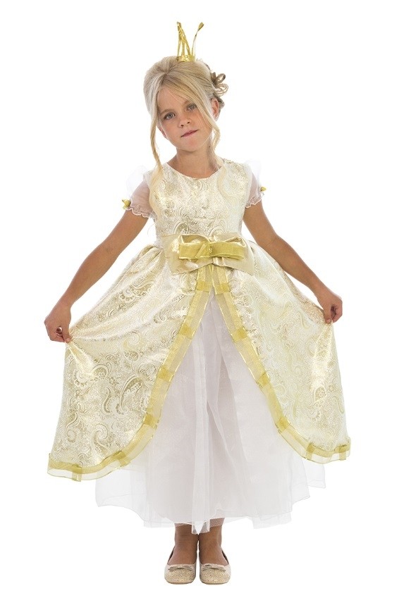 Детский костюм Принцессы Dlx - изящный золотистый костюм, в комплект которого входит длинное платье с блестящими узорами, украшенное золотистым бантом по-середине. К платью прилагается золотистая маленькая корона, которая фиксируется невидимками.