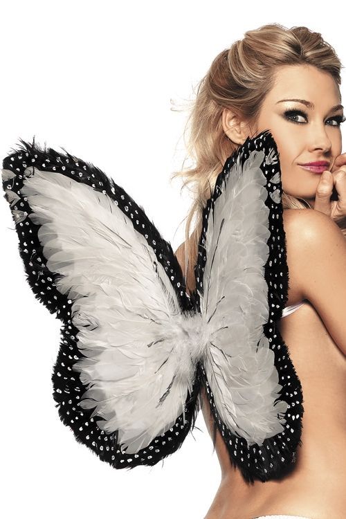 Перьевые крылья бабочки белые прекрасно дополнят образы бабочек. Крылья выполнены из длинных перьев белого цвета с черной каймой и стразами.