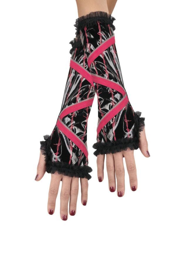Перчатки с молнией прекрасно дополнят рокерские костюмы и подобные образы. Перчатки выполнены в тёмном цвете с чёрной оборкой и красной молнией.(Прочие аксессуары для дополнения образа вы также найдете в нашем каталоге).Рекомендации по уходу: Ручная стирка в тёплой воде.