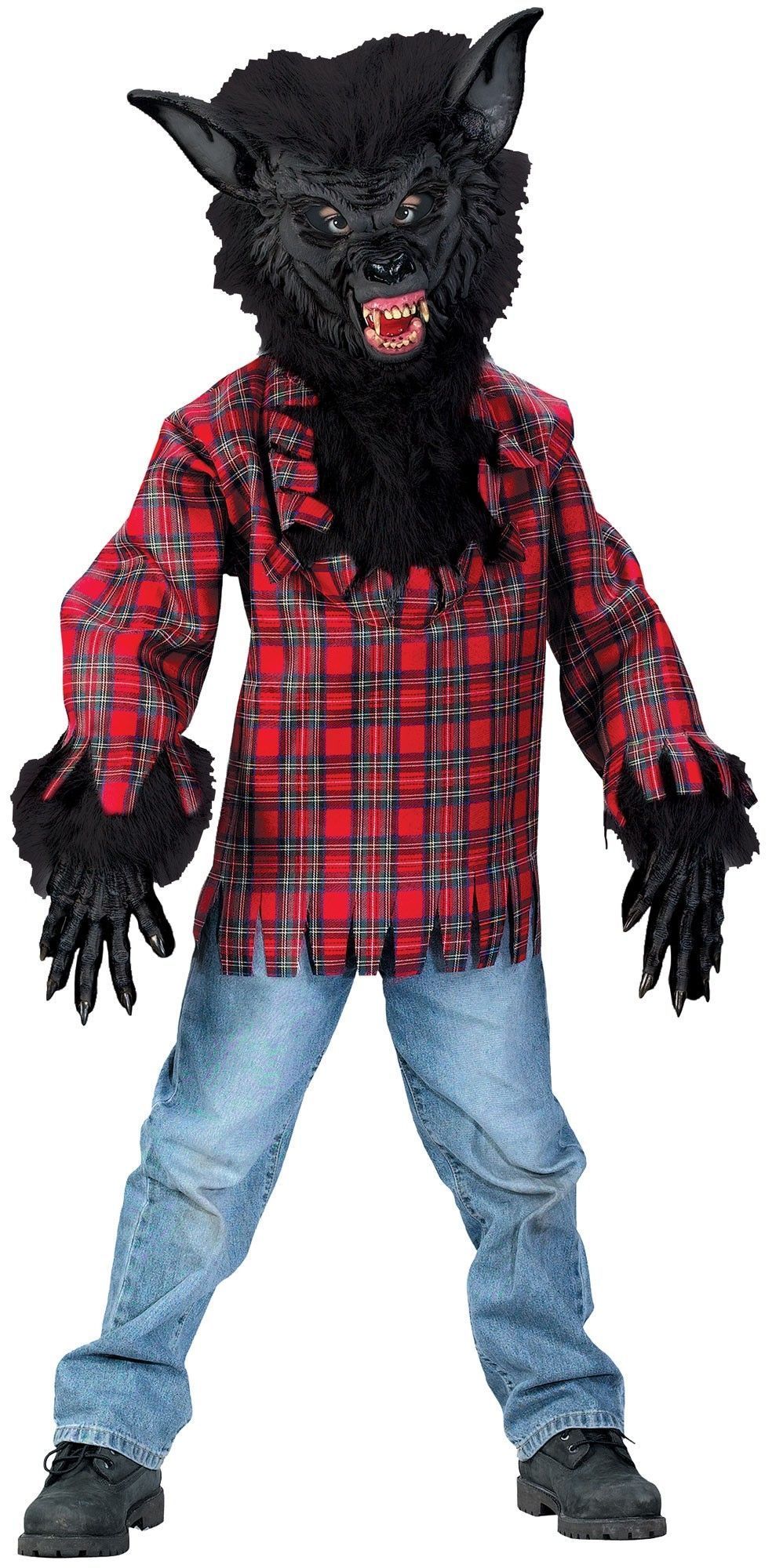Детский костюм оборотня черный включает в себя красную клетчатую рубашку с разорванной грудью и надорванными краями. К ней прилагается черная маска оборотня с жутким оскалом, которая выполнена из плюшевого и латексного материала, а также соответствующие перчатки.