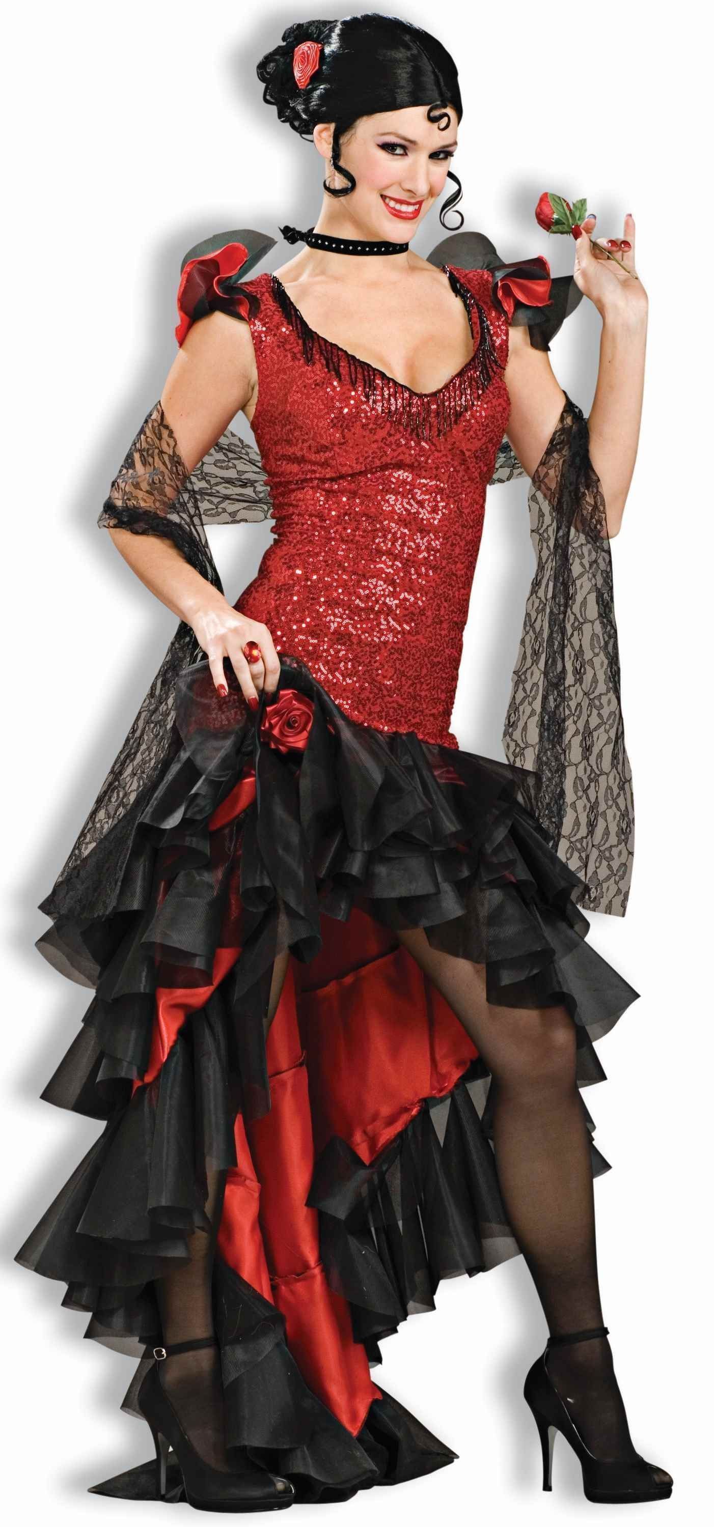 Костюм испанской танцовщицы фламенко включает в себя длинное платье. Топ выполнен в красном цвете из блестящего материала, а многослойная юбка выполнена в черном и красном цветах, она украшена красным цветком. Также в комплект входит колье и кружевная черная шаль.