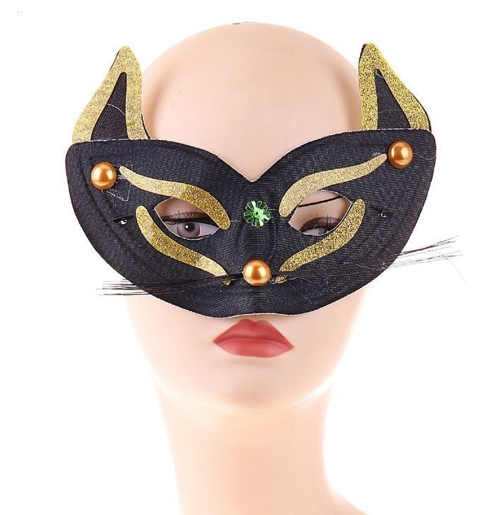 Маска кошки черная с длинными усами, носиком-бусинкой и острыми ушками с золотистой окантовкой. Маску можно надеть с вечерним платьем и придать образу особый шарм.
