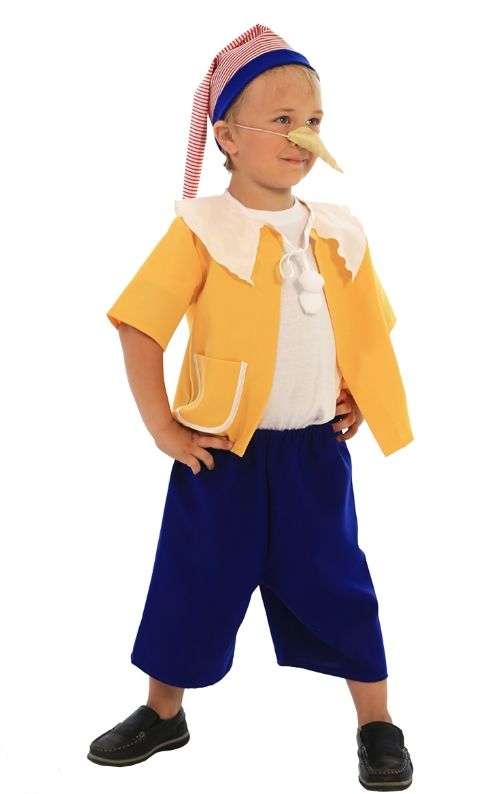 Детский костюм веселого Буратино подойдет для детских утренников и спектаклей. В комплекте костюма имеются синие удлиненные шортики, рубашка на завязках с белым воротничком и карманами, полосатый длинный колпак, а также длинный нос на резинке.