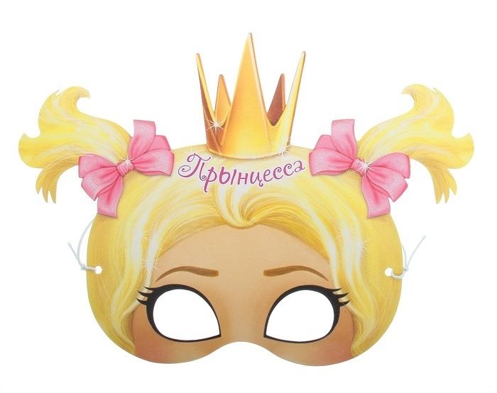 Маска с надписью ПРЫНЦЕССА представляет собой голову милой маленькой принцессы с белокурыми волосами, завязанными в два хвостика розовыми бантиками. Сверху голову украшает корона. Маска сделана из картона и имеет размер 0,1х33х20,9 см.