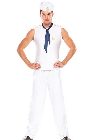 Костюм смелого моряка выполнен в белом цвете с золотыми вставками. Костюм включает в себя белые штаны, футболку без рукавов, морскую кепку и синий галстук. В этом костюме вы можете смело отправиться на тематическую вечеринку, в клуб и на подобные мероприятия.Рекомендации по уходу: ручная стирка в тёплой воде, без применения отбеливателей.