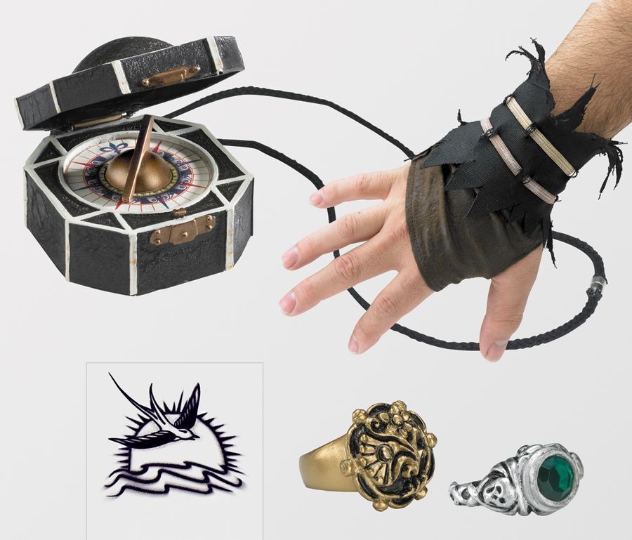 Набор Джека Воробья - прекрасное дополнение к образу Джека Воробья. В комплекте имеется известный и важный для Джека компас, два кольца: золотое и серебряное, временная татуировка и повязка на запястье.