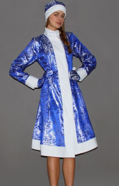 Синий блестящий костюм Снегурочки выполнен из блестящего синего материала с серебряными узорами. В комплект входит шубка чуть ниже колена с белой отделкой. Шубка на липучках. Также к ней прилагаются варежки и шапочка с белым отворотом.