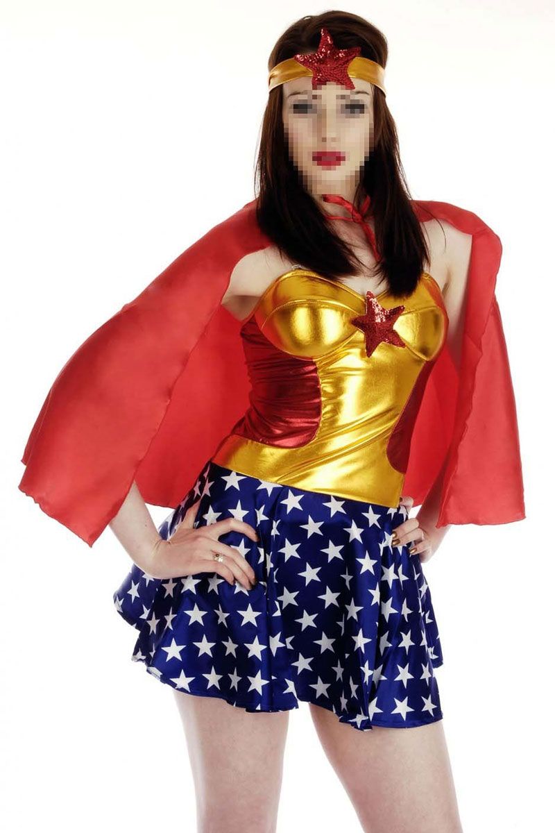 Костюм мисс Америки состоит из платья, повязки на голову, плащ и силиконовые бретельки. Такая мисс станет отличной парой для Капитана Америка. Вместе они сокрушат всех. Образ можно дополнить чулками или туфлями.