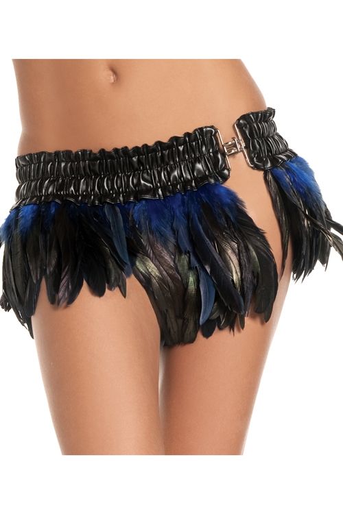 Перьевая юбка черно-синяя выполнена из перьев сине-черного цвета, которые прикреплены к эластичному черному поясу. На поясе имеется застежка.