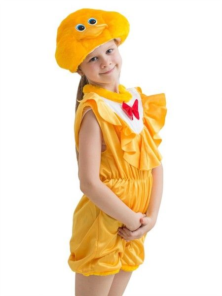 Детский костюм цыпочки включает в себя яркий трикотажный комбинезончик, выполненный в желтом цвете, украшенный рюшами и красным бантиком. Также в комплект входит шапка-маска цыпленка с клювом и глазками.