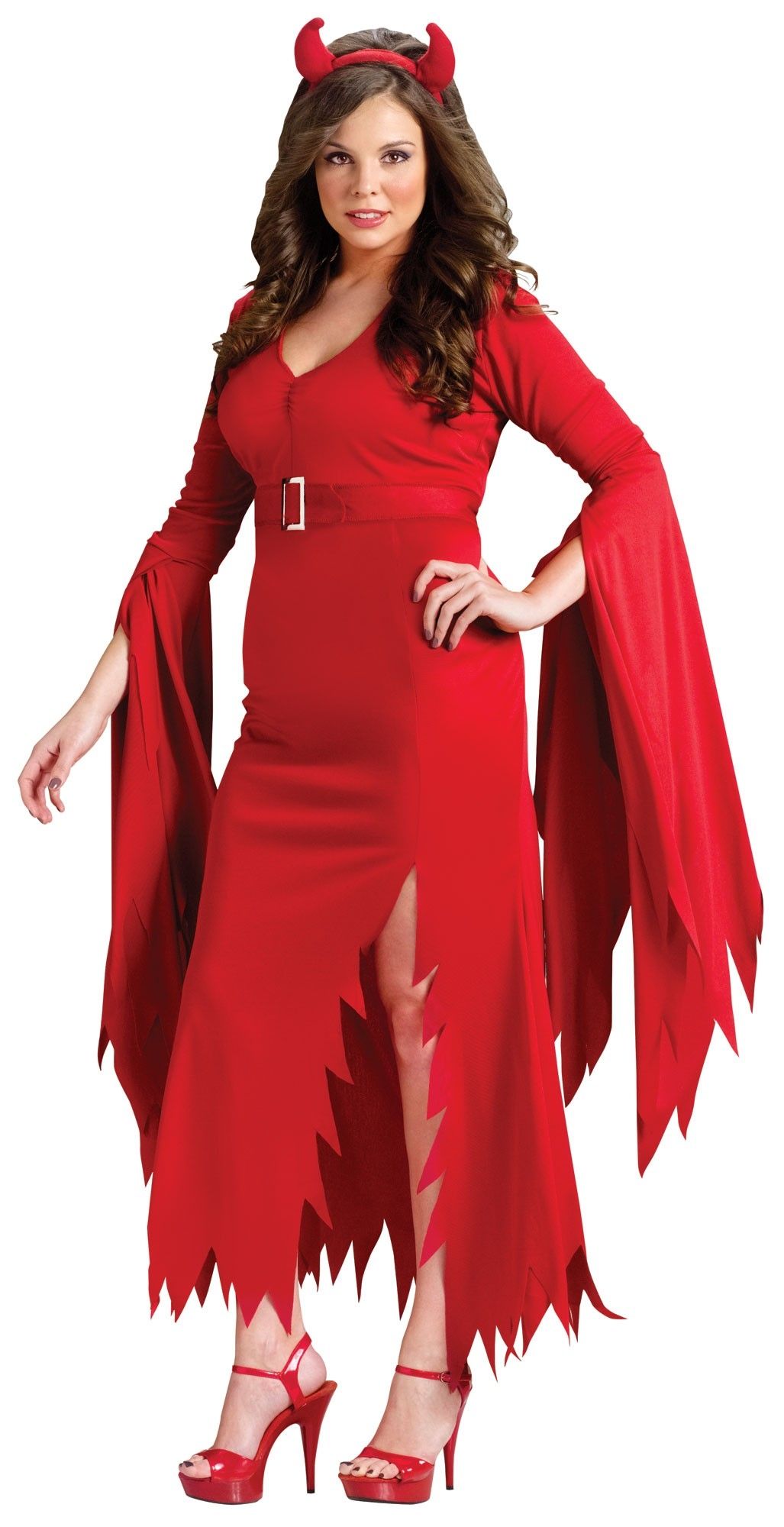 Костюм готического дьявола Plus Size -это ярко-красный костюм, который включает в себя длинное платье с разрезом на юбке. У платья зубчатый подол, а также длинные широкие рукава с разрезами от локтя. К платью прилагается красный ремень с бляшкой и красный ободок с дьявольскими рожками.