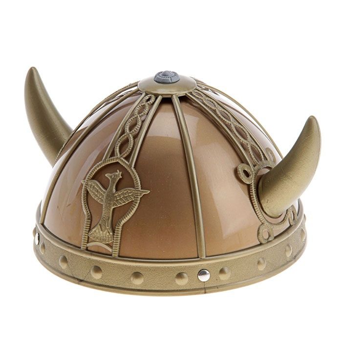 Золотой шлем с рогами выполнен из пластика золотого цвета и декорирован золотистой отделкой и узорами. Главной деталью этого аксессуара являются аккуратные рожки золотистого цвета.