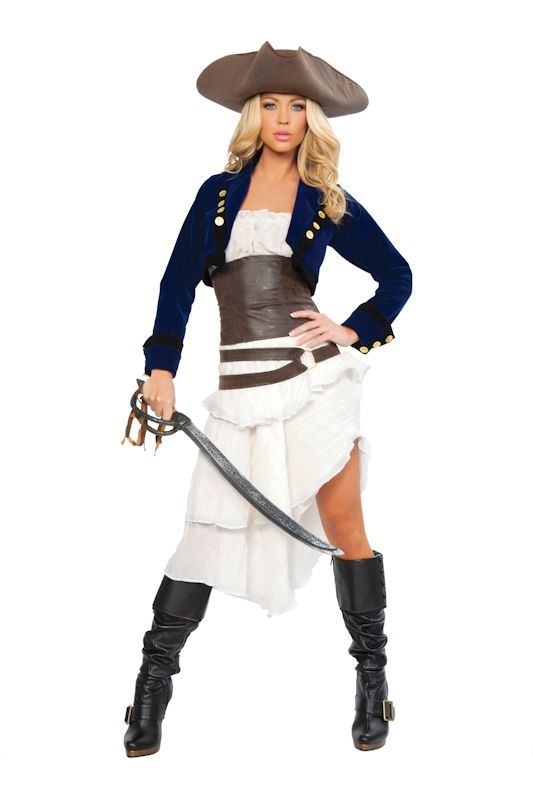 Комплект костюма колониальной пиратки состоит из белого платья, балеро, пояса, корсета, и конечно же из пиратской шляпы и меча.