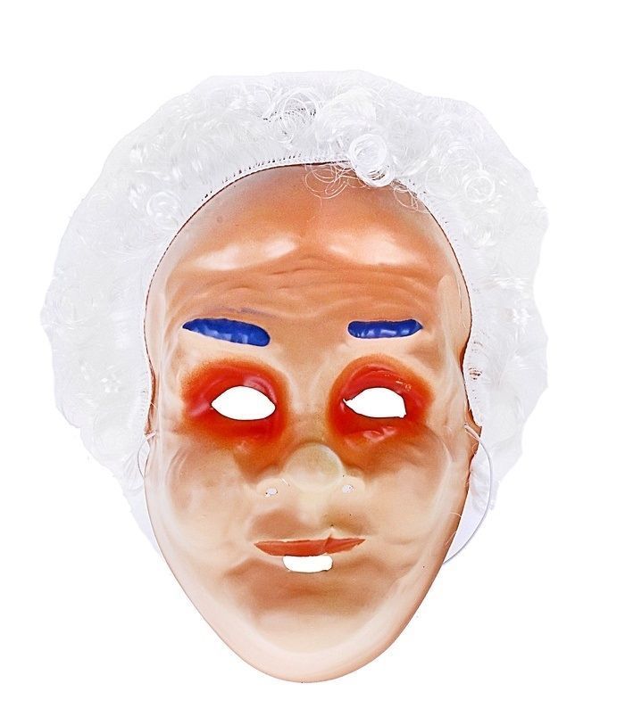 Маска веселого старичка с белыми волосами и синими бровями. Маска изготовлена из пластика, крепится при помощи резинки и имеет размер 9х17х26 см.
