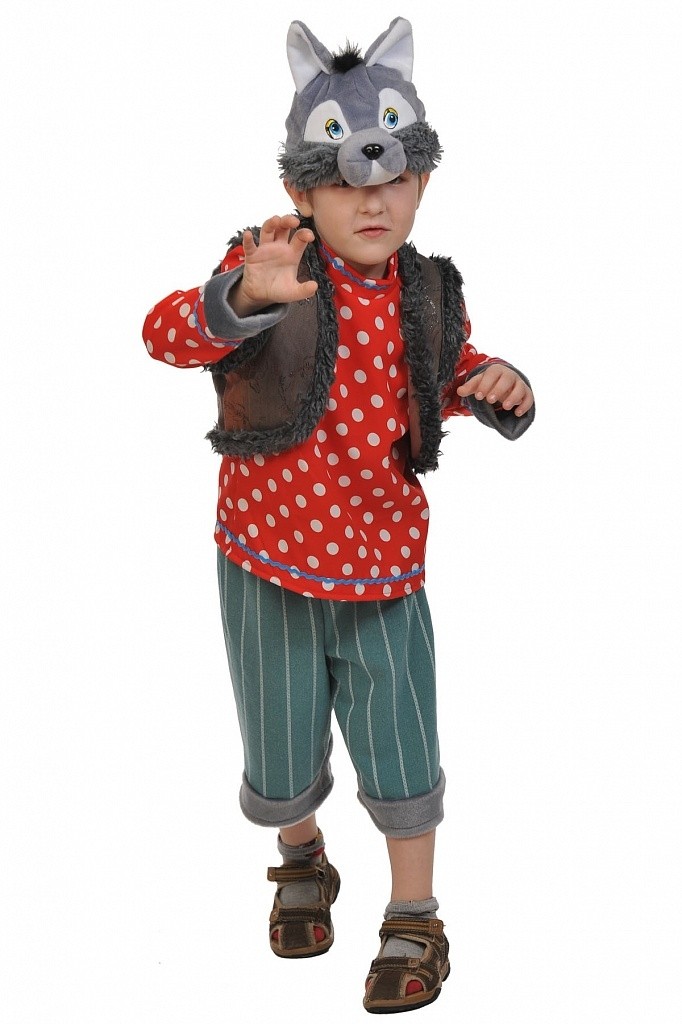 Детский костюм Серого Волка включает в себя полосатые серо-зеленые брюки, красную рубаху в белый горох, коричневый жилет с меховой отделкой, а также серую меховую маску-шапочку в виде мордочки волка.