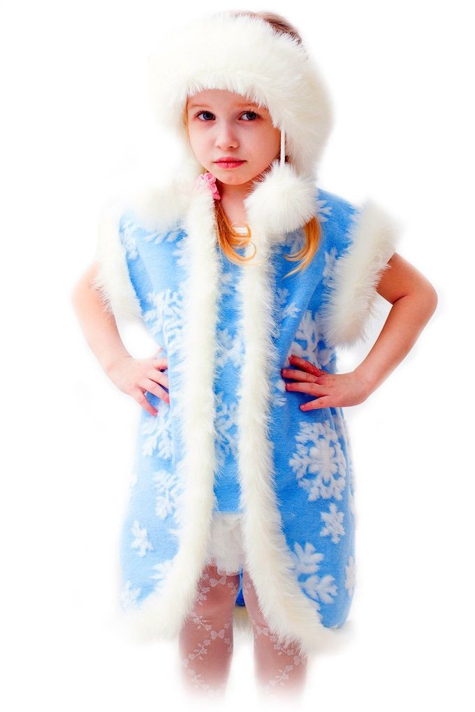 Детский костюм Нарядной Снежинки выполнен из мягкого материала голубого цвета. В комплект входит платье с белой опушкой, украшенное снежинками, а также пушистый головной убор с помпонами.