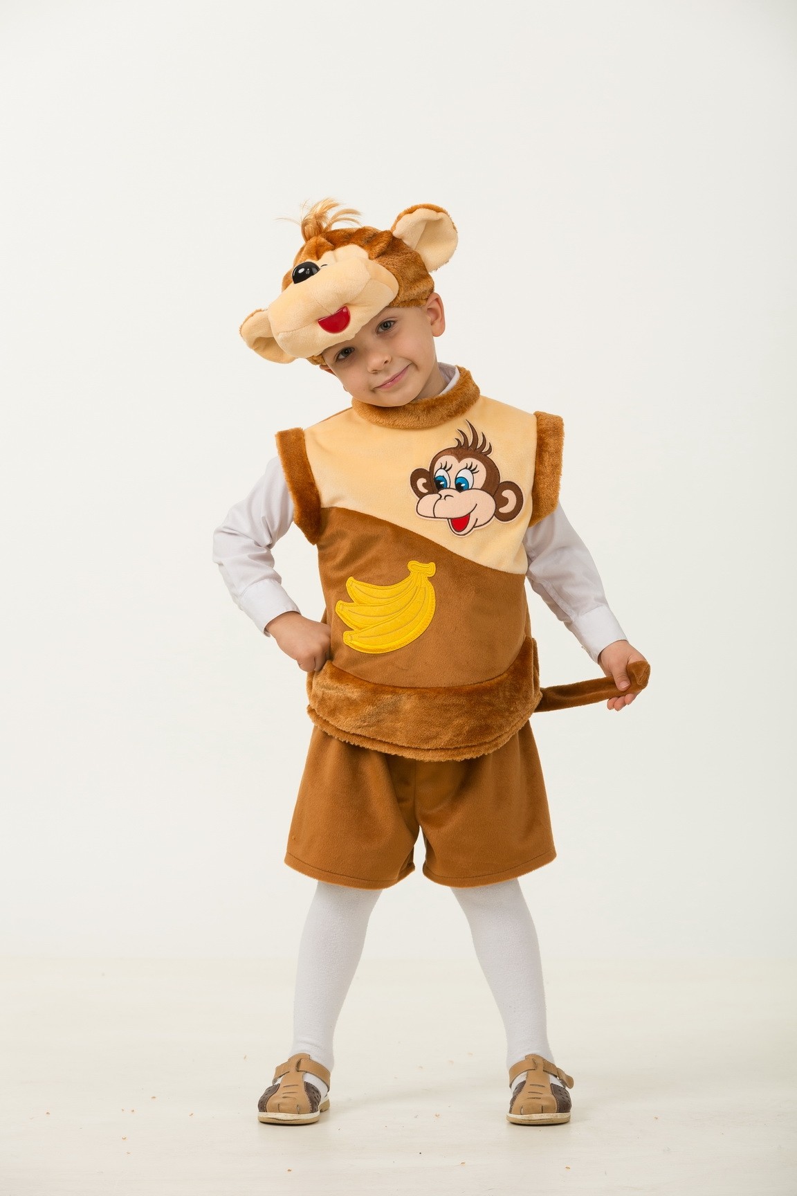 Плюшевый костюм обезьянки - отличный выбор для новогоднего утренника, т.к. обезьянка будет символом 2016 Нового года. Костюм включает в себя короткие шортики с хвостиком, безрукавку с изображением обезьянки и бананов, а также шапочку-маску в виде мордочки обезьянки.