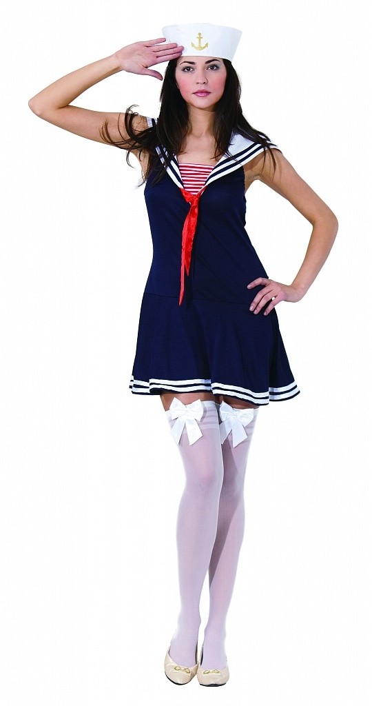 Темно-синий костюм морячки включает в себя легкое платье, выполненное в темно-синем цвете с белым полосатым воротничком, а также белую шапочку морячки.