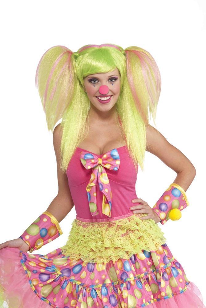 Яркий парик клоунессы станет хорошим дополнением к веселым костюмам клоунесс. Парик выполнен из искусственных волокон яркого зеленого и розового цветов. Волосы заплетены в хвостики, часть волос распущена, также имеется челка.