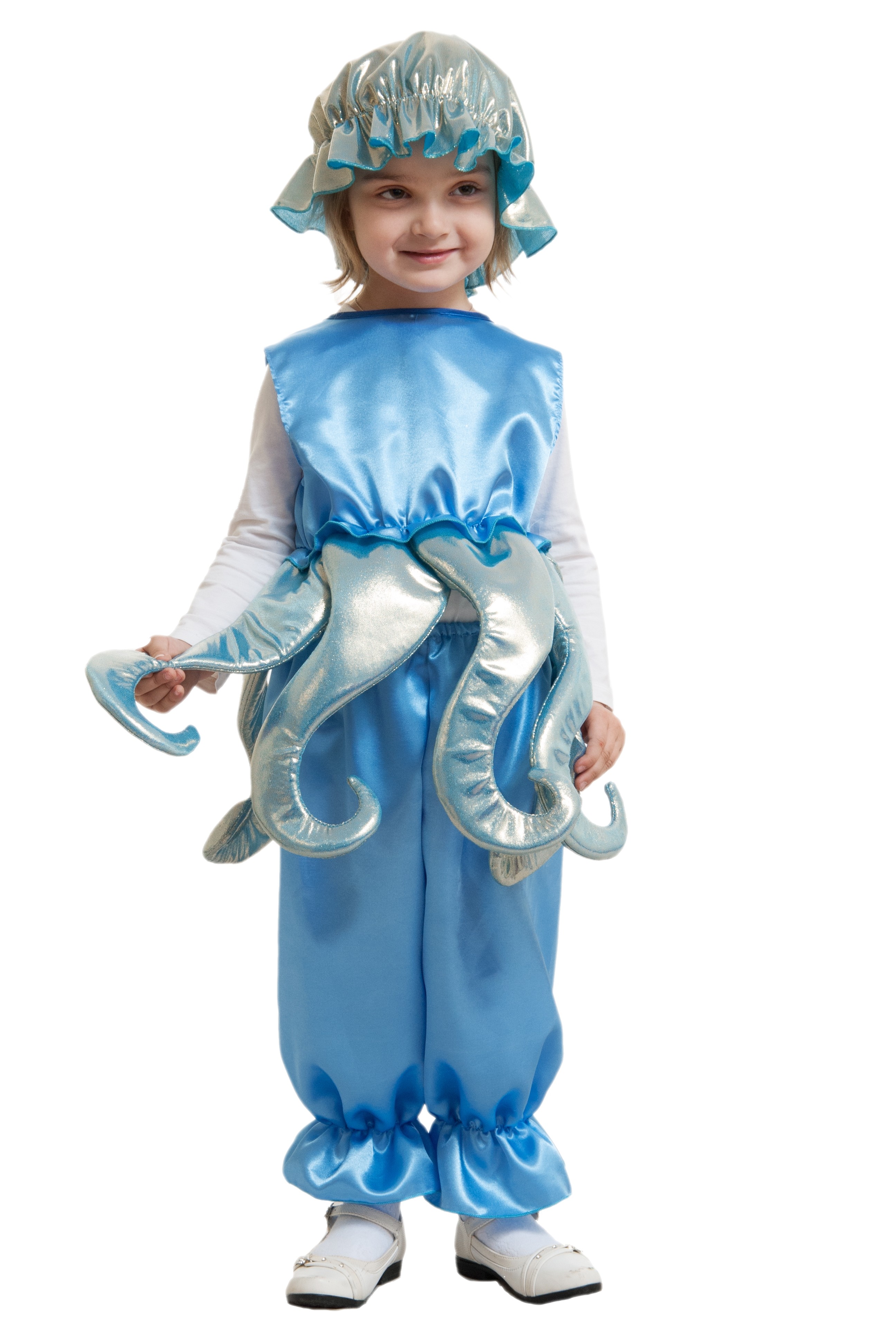 Голубой костюм осьминожки - атласный костюм, выполненный в голубом цвете. В комплект костюма входят штанишки, топ с пришитыми щупальцами, а также светло-голубая шапочка на резиночке.