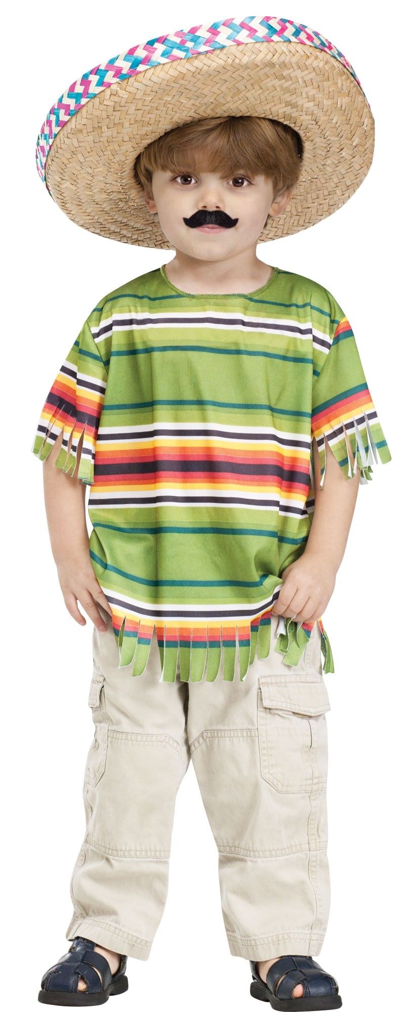Костюм малыша амиго состоит из национальной мексиканской футболки зеленого цвета с полосками и бахромой на рукавах и в нижней части. К ней прилагается соломенная сомбреро, а также черные усы.