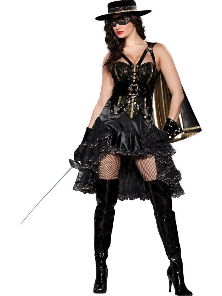 Костюм прекрасной дамы Зорро включает в себя черное платье с золотой отделкой, спереди юбка короткая, сзади длинная и многослойная, в комплект также входит короткий плащ на ремнях, перчатки, черная шляпа с золотой отделкой, а также маска на глаза.