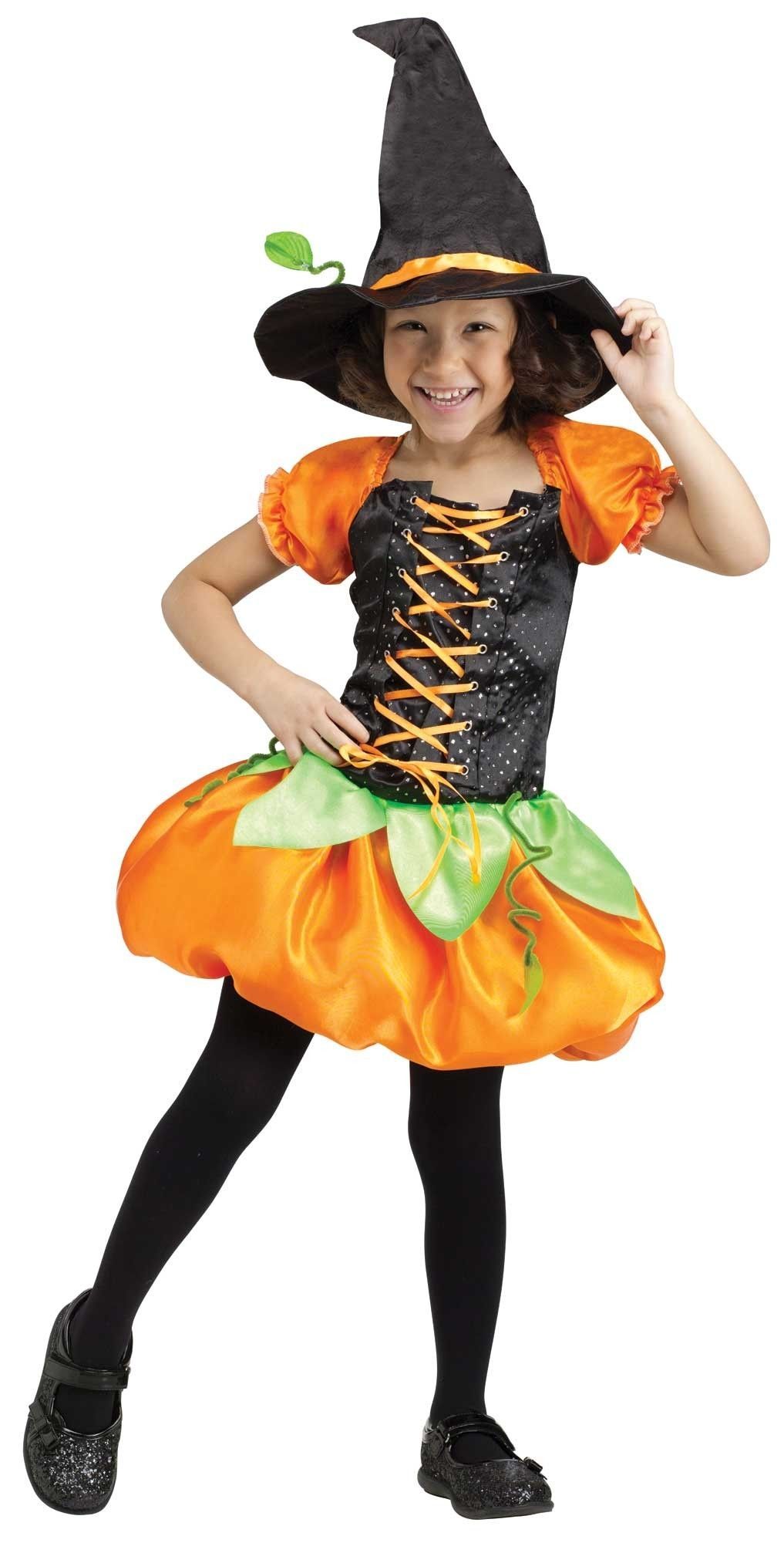 Детский костюм Тыковки включает в себя платье, топ которого выполнен в черном цвете с оранжевой шнуровкой и оранжевыми рукавами-фонариками. Юбка платья выполнена в оранжевом цвете с зелеными листиками. Образ завершает высокая конусная шляпа черного цвета.