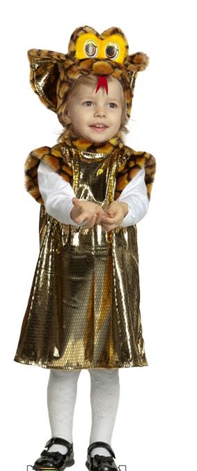 Детский костюм змейки Коброчки включает в себя платье золотистого цвета с меховой отделкой, а также мягкий головной убор. В этом костюме ваша девочка может пойти на Новогодний утренник и подобные праздники.(Прочие аксессуары для дополнения образа вы также найдете в нашем каталоге).Рекомендации по уходу: Только чистка по месту загрязнения.