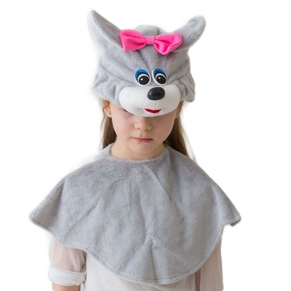 Комплект мышки эконом выполнен из мехового материала серого цвета. Шапка-маска в виде мордочки мышки украшена розовым бантиком, также к ней прилагается накидка на плечи с липучкой.