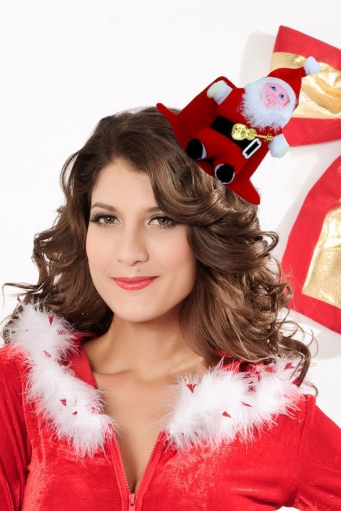 Шляпа с музыкальным Сантой выполнена в красном цвете к ней прикреплен Санта в красном костюме и колпаке и с золотой гитарой за поясом. Также имеются другие куклы, которые можно прикрепить к шляпке.