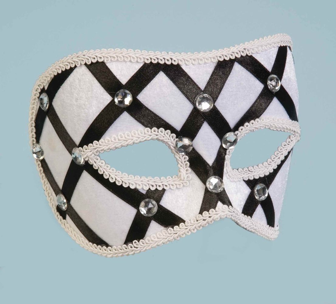 Бело-черная венецианская маска - это маска на глаза, выполненная в белом цвете с белой каймой. Маска украшена черными переплетающимися ленточками и крупными стразами.