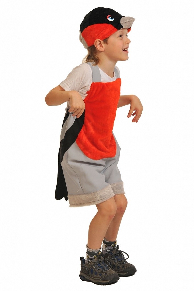 Детский костюм Снегиря отлично подойдет для постановок детских сказок и подобных мероприятий. В комплект костюма входит комбинезон с шортиками серого цвета и с красной грудкой, а также шапочка-маска в виде мордочки Снегиря с клювом.