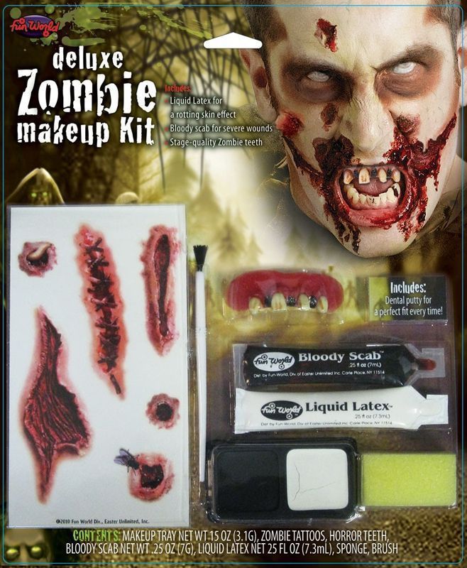 Грим для зомби - это набор, который сможет дополнить любой костюм зомби. В этот набор входят накладные шрамы, косметика чёрного и белого цвета, зубы зомби со специальным клеем, жидкий латекс, кровавые струпья, кисточка и губка. Воспользовавшись этим набором вам удастся сделать из себя жуткого и устрашающего зомби.