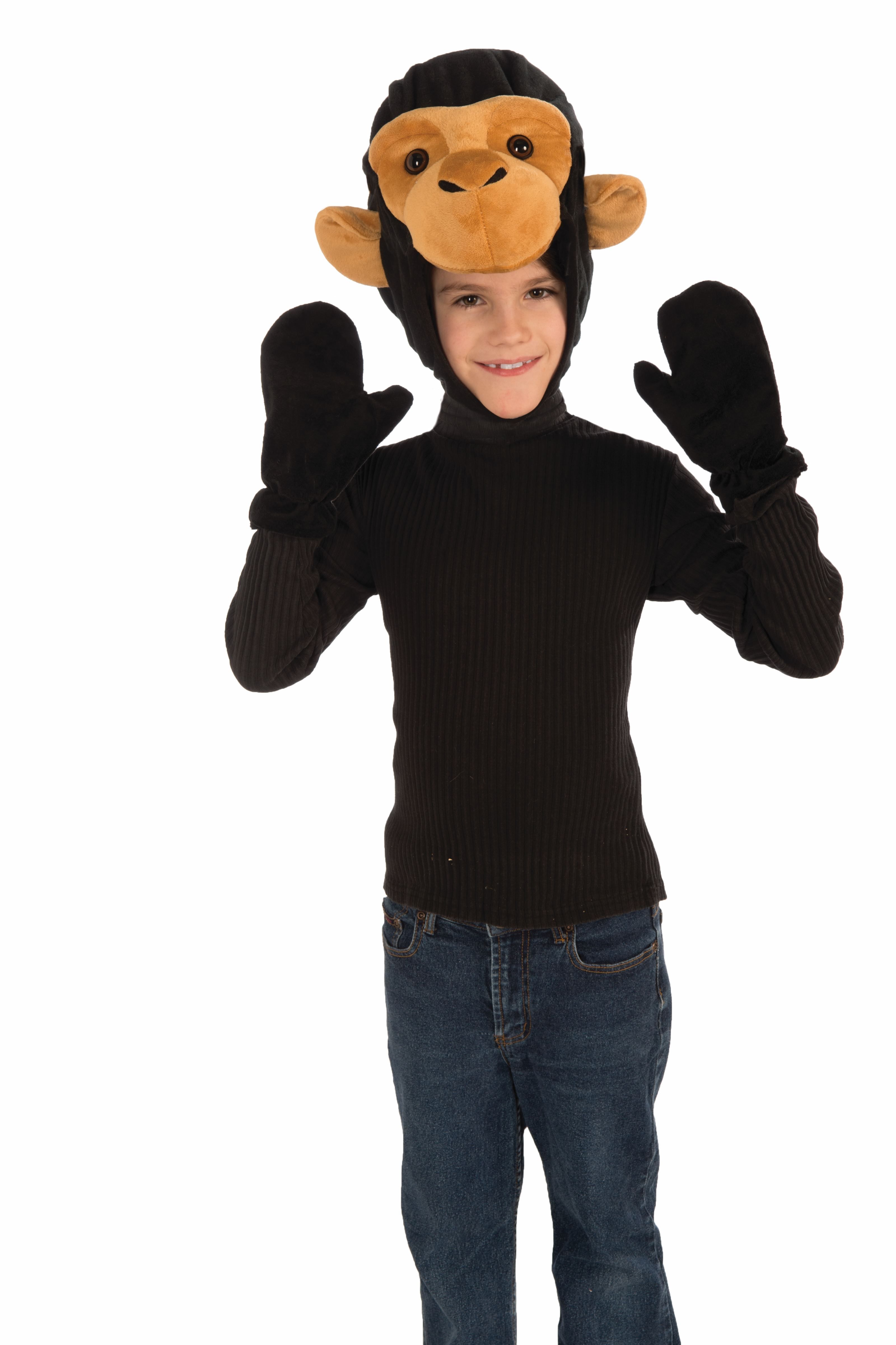 Детский набор обезьянки выполнен из плюшевого материала и включает в себя теплые перчатки-лапки, а также капюшон-маску в виде мордочки обезьянки с ушками.