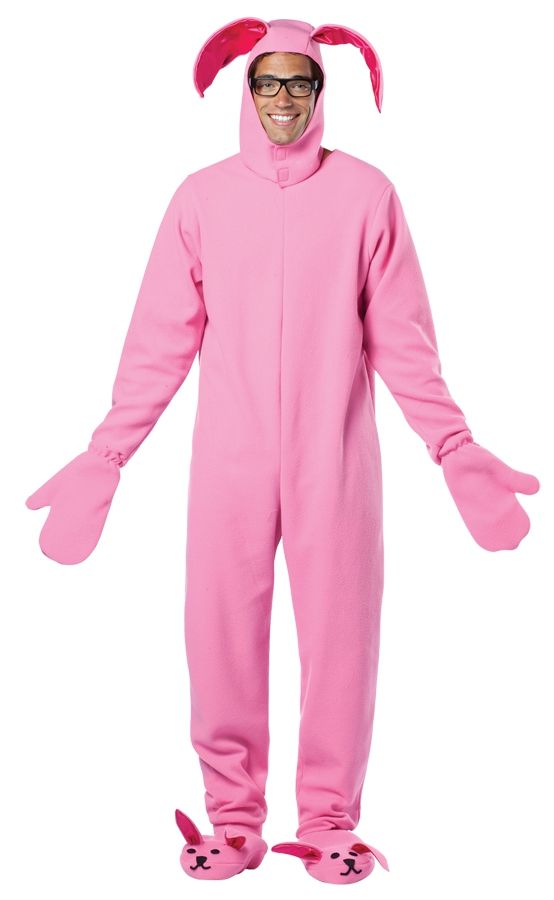 Розовый костюм Рождественского кролика включает в себя комбинезон, тапочки, перчатки и головной убор. Такой костюм прекрасно подойдёт для Рождественских праздников и подобных мероприятий.