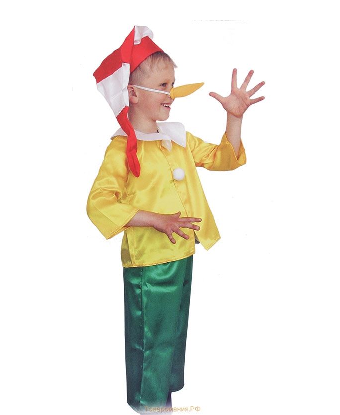 Костюм задорного Буратино включает в себя: зеленые шорты, жёлтую рубашку с белым воротником и декоративными помпонами, колпак в красно-белую полоску и нос.