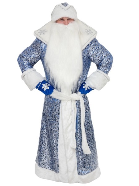 Костюм царского Деда Мороза выполнен из блестящей синей парчи с меховой отделкой. В костюм входит длинная шуба с серебряными узорами, меховыми воротником, манжетами и отделкой; к шубе прилагается пояс, а также шапка с меховым отворотом, синие варежки, украшенные серебряными снежинками и меховая белая длинная борода - незаменимый атрибут для Деда Мороза!