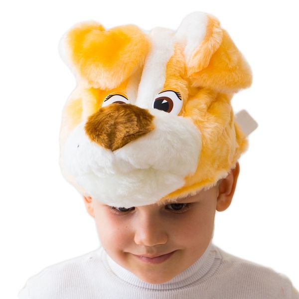 Шапка-маска Собачка Буранчик - меховая шапка с мордочкой собачки, выполнена из мехового материала желтого и белого цветов.