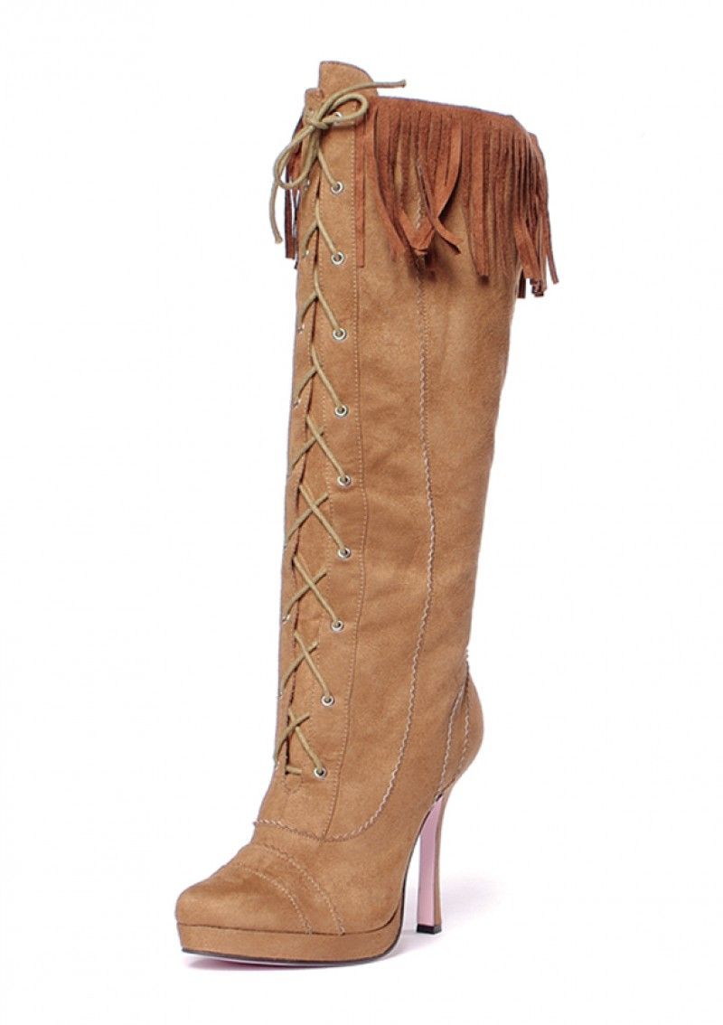 Сапоги индейской девушки выполнены в светло-коричневом цвете. Это длинные сапоги до колен, которые по бокам украшены бахромой. Спереди имеется шнуровка. Высота каблука около 11 см.