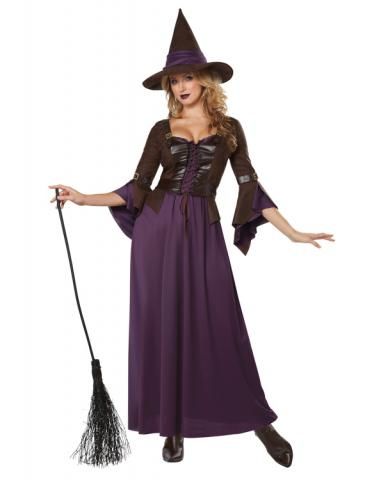 Костюм готичной ведьмы включает в себя длинное фиолетовое платье с пришитым жилетом и длинными расклешенными рукавами. Также комплект дополняет конусная шляпка ведьмы.
