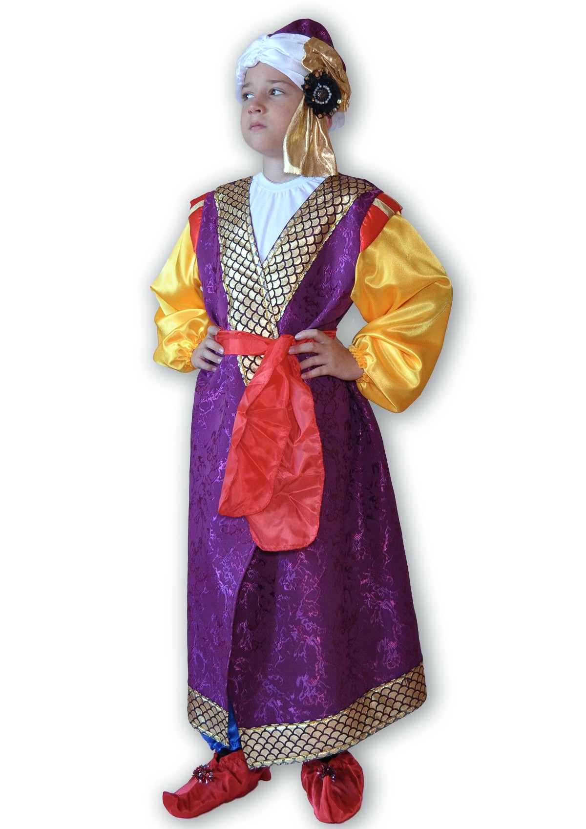Детский костюм Султана включает в себя длинный фиолетовый халат с желтыми широкими рукавами, красный широкий пояс, красные тапочки с закругленными носами, а также бело-фиолетовую чалму с золотистой аппликацией сбоку.