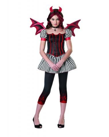 Костюм маленькой дьяволицы включает в себя корсетное платье с короткой полосатой юбочкой и полосатыми рукавами-фонариками. Также в комплект входят черные леггинсы с принтом пламени. Дополняют образ небольшие крылья черного цвета с красной отделкой, красные рожки и ожерелье на черной ленточке.