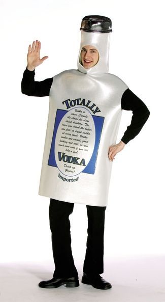 Костюм Бутылка водки - это серая туника, сделанная в форме бутылки водки с логотипом. На горлышке бутылки имеется отверстие для лица. Такой костюм подойдёт для различных весёлых вечеринок, рекламы и других мероприятий.