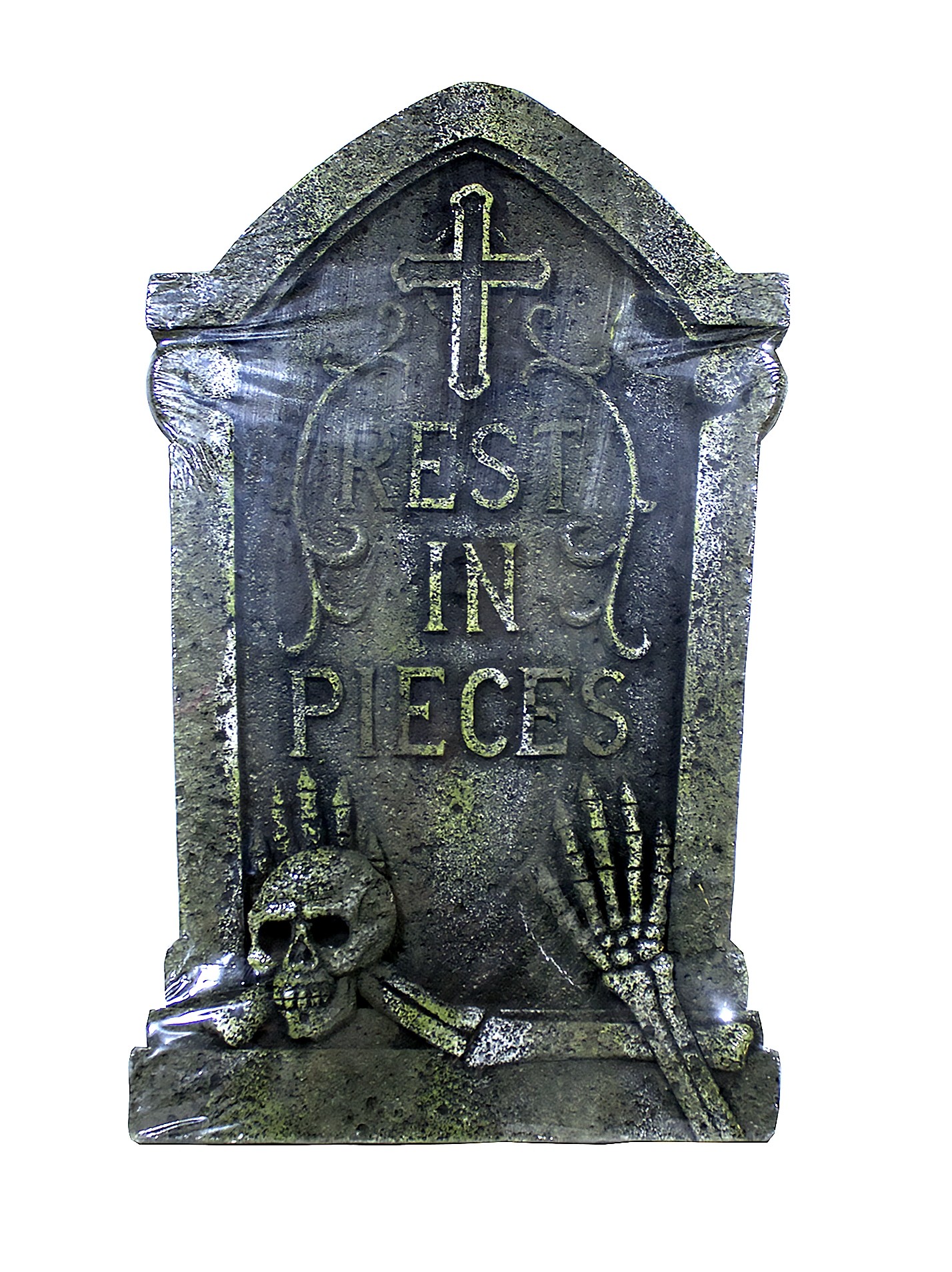 Серо-зеленое надгробие станет отличным украшением для вечеринки в честь Хэллоуина. Надгробие выполнено из пенопласта, имитирует тяжелую надгробную плиту серо-зеленого цвета.